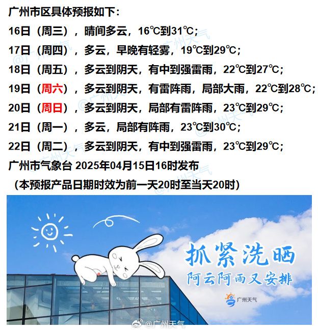 2025广州最近一周天气预报(持续更新) 一、过程天气预报 4月16日,晴间多云,天气干燥; 4月17日,云量增多,湿度增大,部分地区早晚有轻雾; 4月18-19日,受高空波动和低层偏南气
