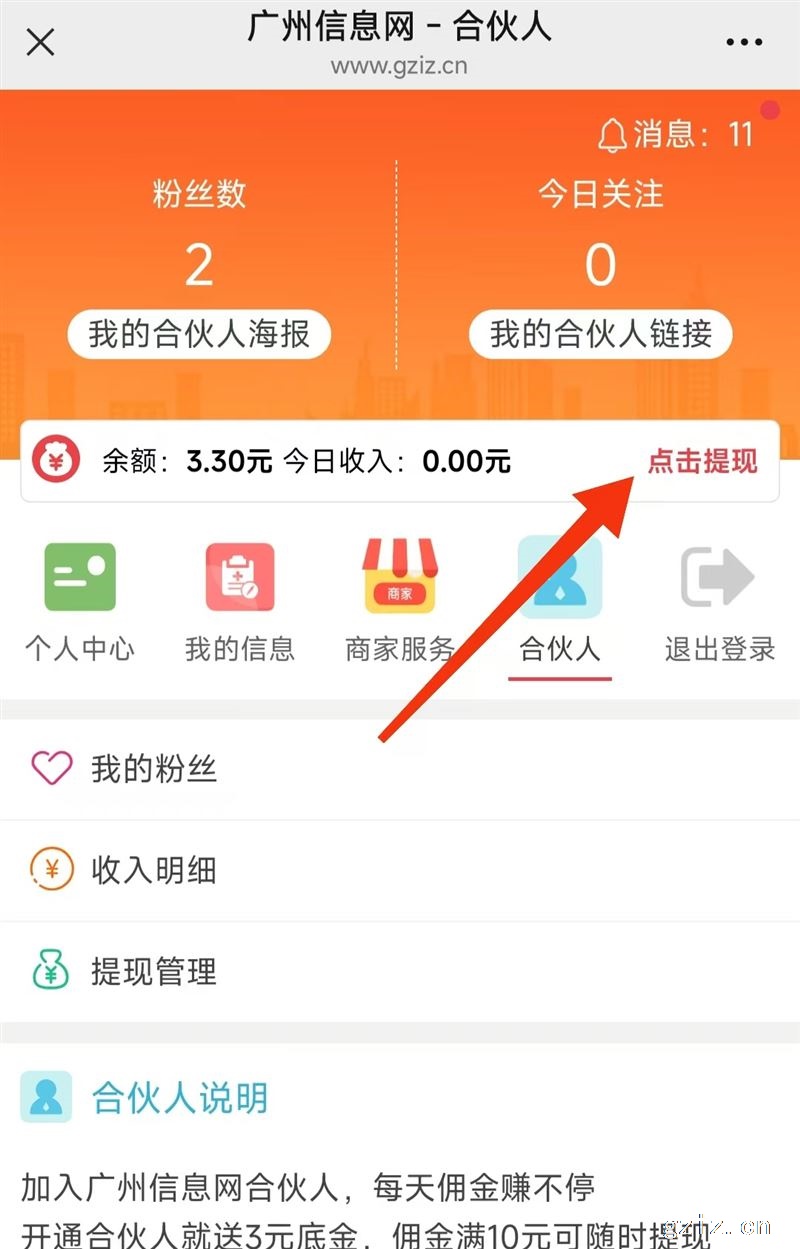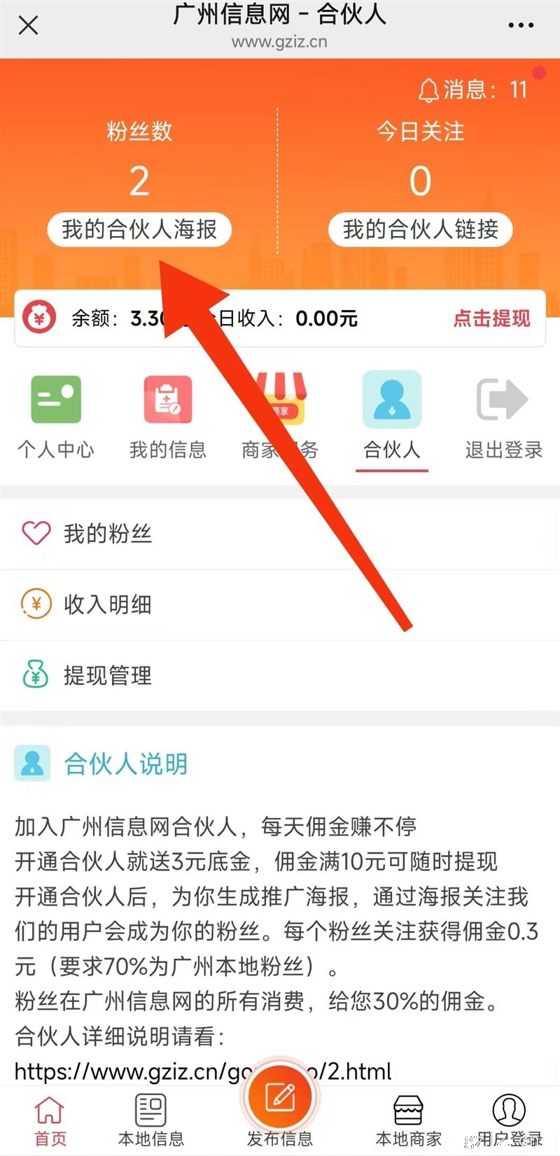 点击我的合伙人海报,把海报保存到手机,分享到朋友圈或好友